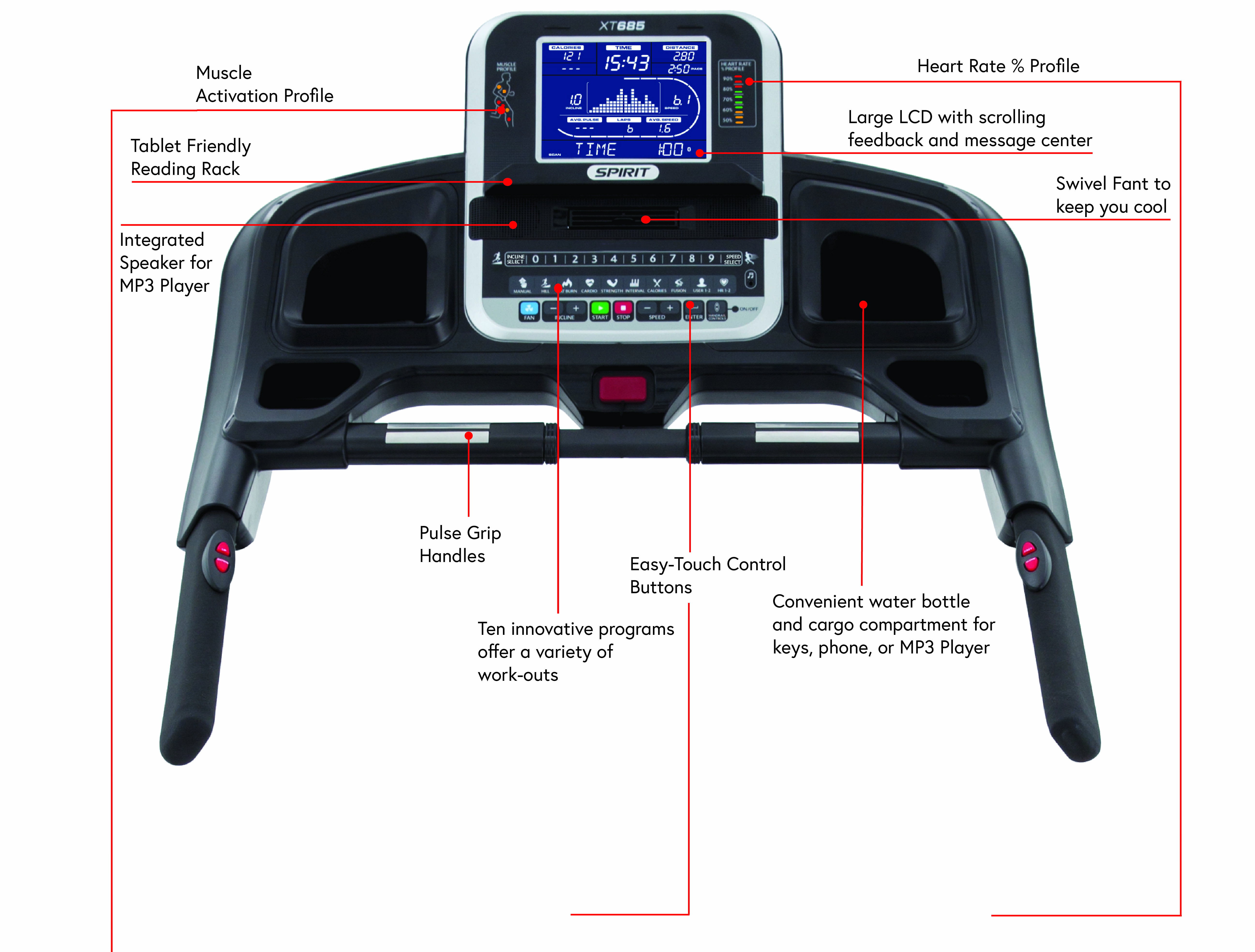 All of our home treadmill consoles have easy to read, bright blue LCD screens. The consoles and keypads are positioned so you can easily reach them to set up your program and push start. Our contact heart rate grips are comfortably located in the proper ergonomic position. Our center mounted swivel fan (found on all our home treadmills) helps keep you cool during your workout. We have also located the water bottle / cargo holders for easy access. Put your water in one and your MP3 / cell phone into the other so you can listen to your favorite music.
