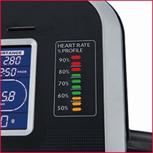 Heart Rate training is proven to be one of the best ways to measure your workout. Our Heart Rate % Profile gives you a quick reference of your % compared to maximum projected heart rate. This is determined by your age, which you entered during the programming phase of any of the programs. The LED lights up in Amber for 50-60%, Green for 65% to 80%, and Red for 85%+. This is a quick reference for you to gauge your workout.